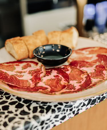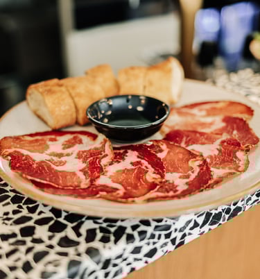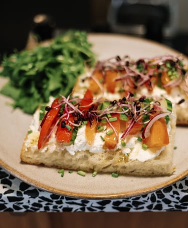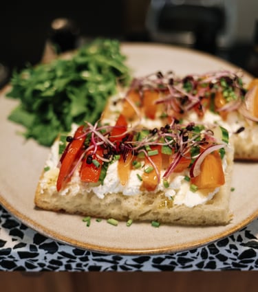 stacciatella, poivron rouge mariné, coppa, tapenade, roquette